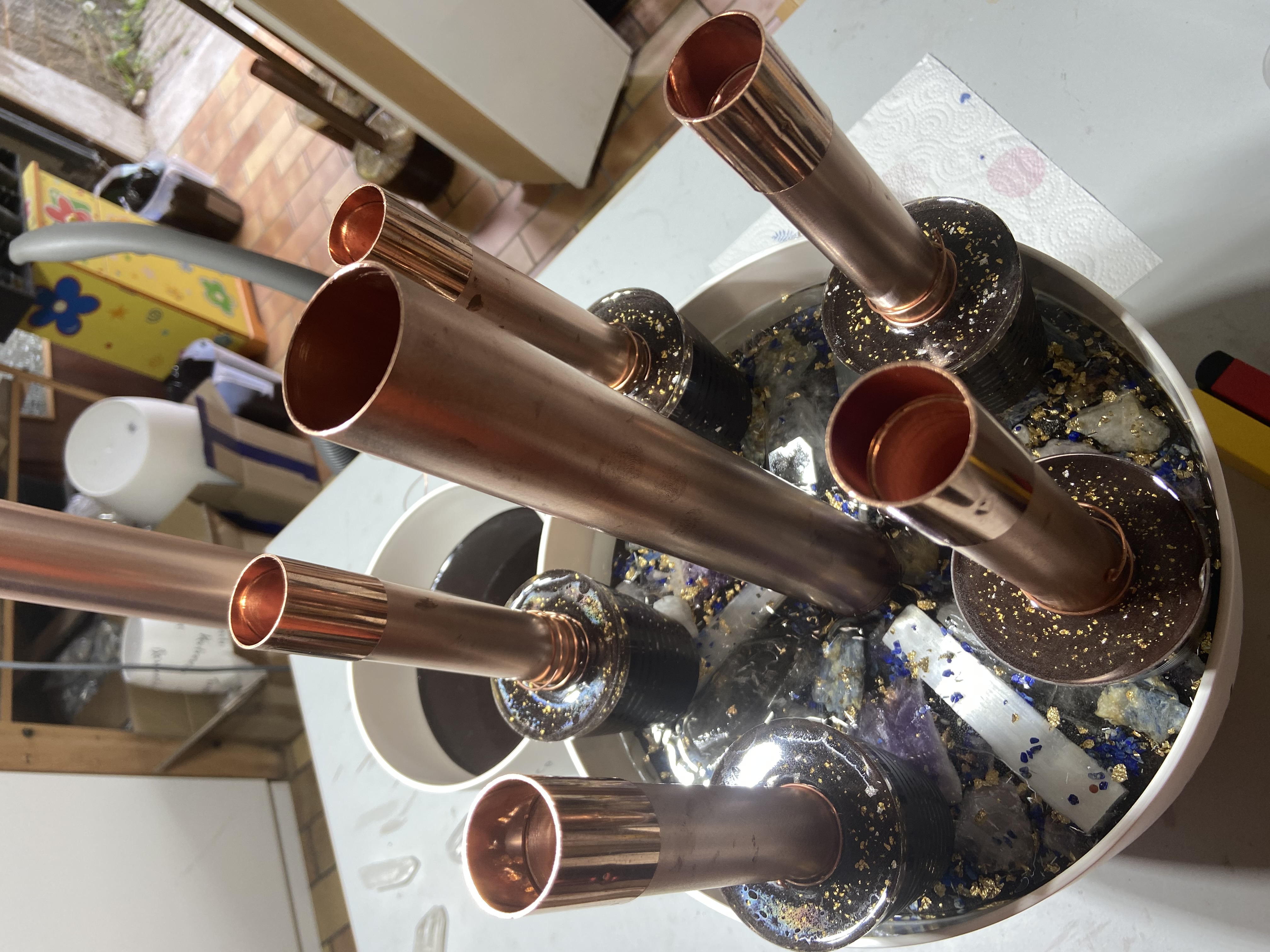 Das Zusammenfügen der Komponenten erfordert Sorgfalt und Präzision. Beginnen Sie damit, Ihre Metallspäne gleichmäßig im Harz zu verteilen, bevor es aushärtet. Legen Sie dann den Quart-Kristall in eines der Rohre, um die Orgonenergie zu konzentrieren. Beachten Sie beim Ausgießen des Harzes in die Rohre, dass alle Materialien gründlich bedeckt sind, da diese Kombination für die Funktion des Chembusters als Orgonit-Cloudbuster entscheidend ist.